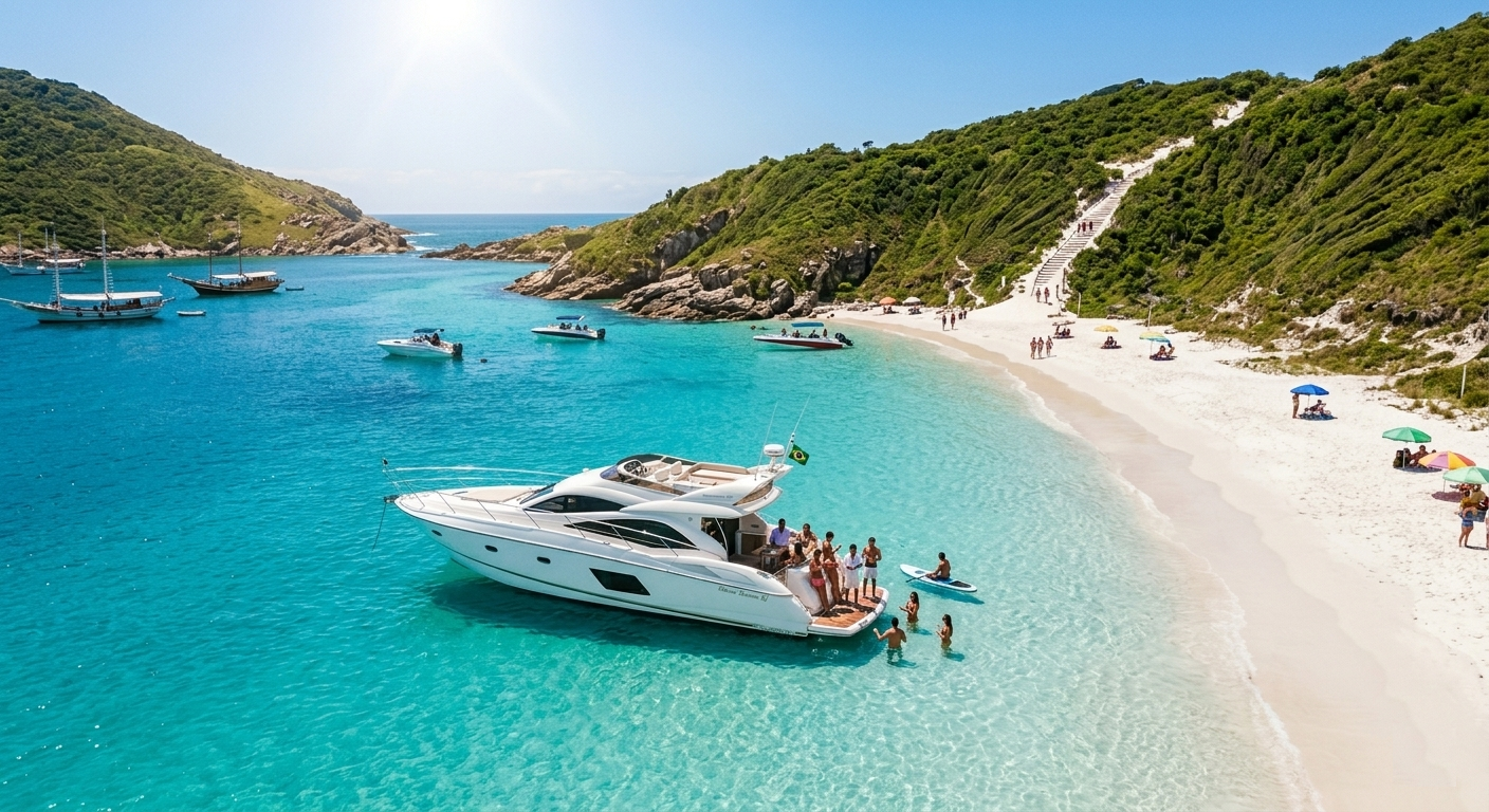 11h: O Ápice em Arraial do Cabo: Às 11h da manhã, quando a luz do sol revela a transparência máxima das águas, nossa lancha já está ancorada no Caribe Brasileiro. Aproveite a Praia do Farol e as Prainhas do Pontal sem a pressa dos passeios coletivos. Para o almoço, nossa indicação de elite é o sofisticado Restaurante Saint Tropez.